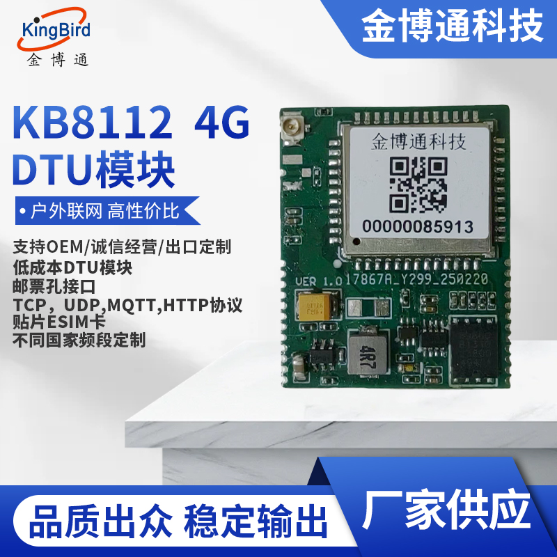 隨著物聯(lián)網(wǎng)的發(fā)展,越來(lái)越多的用戶單位需要將自己的產(chǎn)品配上4G模塊來(lái)上物聯(lián)網(wǎng)系統(tǒng),但用戶買來(lái)4G模塊后,需要進(jìn)行軟件和硬件的開發(fā),這得必須配上一位軟件工程師和一位硬件工程師,而且產(chǎn)品從開發(fā)到成熟,至少要半年、一年甚至兩年的時(shí)間,人力成本至少要投入20萬(wàn),而且耗時(shí)又長(zhǎng)。而我公司推出的KB8112 4G DTU模塊,是在4G模塊基礎(chǔ)之上將軟件,硬件(電源,天線,SIM卡等)全部開發(fā)成熟的4G DTU模塊,用戶可直接使用,無(wú)需軟硬件的開發(fā),它支持TCP/UDP/MQTT/HTTP的協(xié)議,而且成本低,體積小,含貼片ESIM卡(配四年的流量),郵票孔接口,方便用戶大批量的貼片生產(chǎn)。